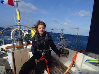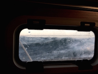 Yesterday afternoon (Tuesday) was pretty uneventful. Pretty rough still, so a trial to do anything needing physical coordination, but with a lifetime of such lack of coordination, it wasn’t too bad My salopettes now have a distinctive ginger smell having worn an entire cup of steaming ginger tea at 3 am. Still, it washed off some of the ingrained curry from Monday evening. The wind remained at Force 6 or 7 through the night to keep us and the autopilot on its toes. We launched the water tow generator in the middle of the night, tiring of constantly running the engine to feed the autopilot beast with juice. It sounds from below very like a very peaceful snoring, so Harriet shot out from her bunk in a panic thinking i had fallen asleep on my watch.
