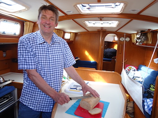 Talking of dogs, life on board centres around meals and treats. We ate some of the excellent bread (photograph included below) and had Harriet’s signature sandwiches for lunch. Supper was new potatoes with chorizo, green beans and asparagus. Later today we will roast our last piece of fresh meat - a leg of lamb. Tonight is a celebration. We passed the half way mark in the night, in terms of miles to our destination. Admiralty charts are 3ft 6” square, so, outside a RN frigate (and particularly on a small boat), they have to be folded down the middle to fit the chart table. We are approaching this fold, which is a psychological lift, signalling good progress. So, for this evening we will dress up for the Crease Party. We may even have a glass of wine to wash down the Stugeron (anti-sea sickness pills.)
