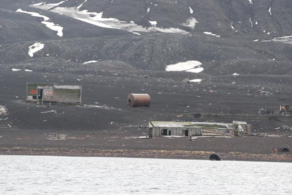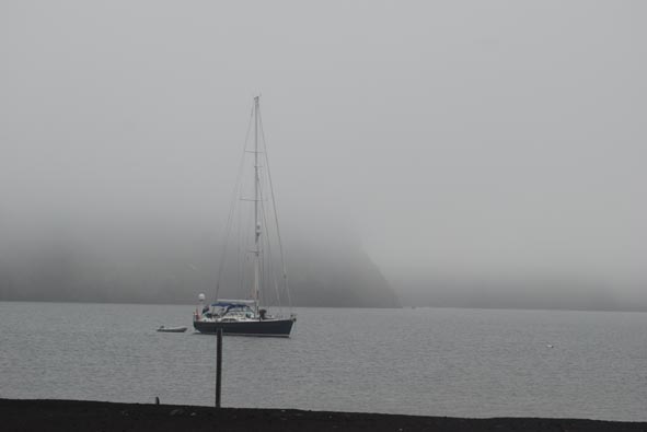 Nik gives Gabriele a Zero Coke from the cockpit fridge (which is turned off and still plenty cold) and remarks, “Coke without sugar is like a Play Station without a remote control.” We going nicely now on track and have a new weather map and ice report; a passing ship has confirmed there is no ice at Deception Island where he’d just come from, so we’re not so worried about arriving before full light. It only gets really dark for a few hours after which there is an extended half light before dawn. All grey everywhere. Barometer down 12 milibars in the last 24. Air Temp 4C, Water Temp 6C. First Whale spotted. Too quick for pictures. Alternator fan belt on engine had to be replaced. We sailed through the night into grey pea soup. Two or three sea lions swam by and one of them lifted his flipper as though to wave at us. We entered “Neptunes Bellows” just before 8, and anchored at Whaler’s Bay home of a disused whaling station closed 1931. The crew celebrated with a Steve Fry Up which I watched having had my porridge. This volcano is still active; in 1923 the water boiled and burned the paint off anchored ships. In 1930 the floor of the harbour dropped 3 metres during an earthquake. As recently as 1992 eruptions forced the evacuation of research stations, and there is a published emergency evacuation plan. As we entered, the sea temperature rose from 5C to 10 C. Paulo Nik and I have been ashore visiting the whaling station. Paulo and I have relieved Steve and Gabriele on the boat so they get a turn. We met a Spanish expedition leader doing research here who told us we were lucky there were no cruise shops here today, otherwise there would be 200 people wandering around our private site. Incredibly as we still seem to have a Fleet 33 connection I will send of a few snaps, they may not be great but they are hot off the press. While we were ashore the boat practically disappeared from view as the fog settled in. You can see the approach to the island, which is very Santori in shape, some of the landscape, bits of the whaling station and a few local residents. |