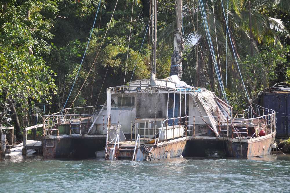 While Demetri was diving Steve and I explored the little river and found lots of expensive houses and locals fishing from the opposite bank. I attach a few snaps including a couple of abandoned boats, the trimaran looking like a left over from “Waterworld.”