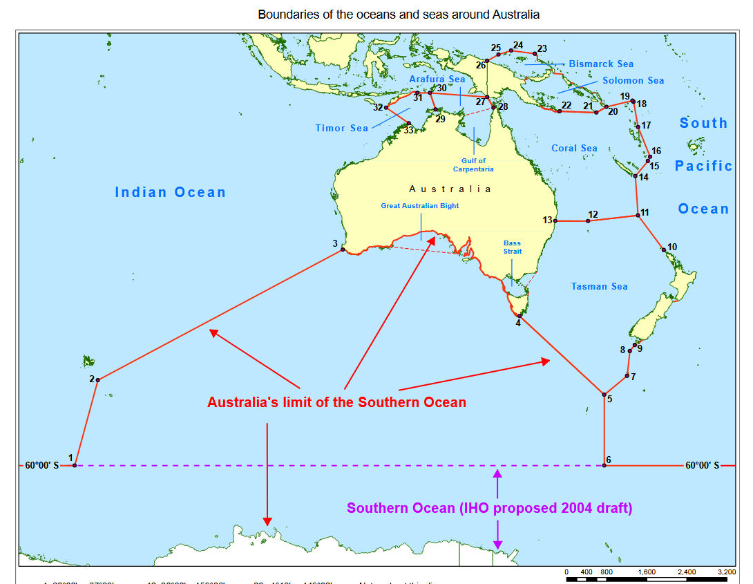 in 2002 that the Southern Ocean should be recognised as the waters south of 60º S, and that the boundary between the Indian Ocean and the Pacific Ocean is at the meridian of 146º 55’ E, at South Cape, Tasmania, but this boundary has yet to be ratified. In