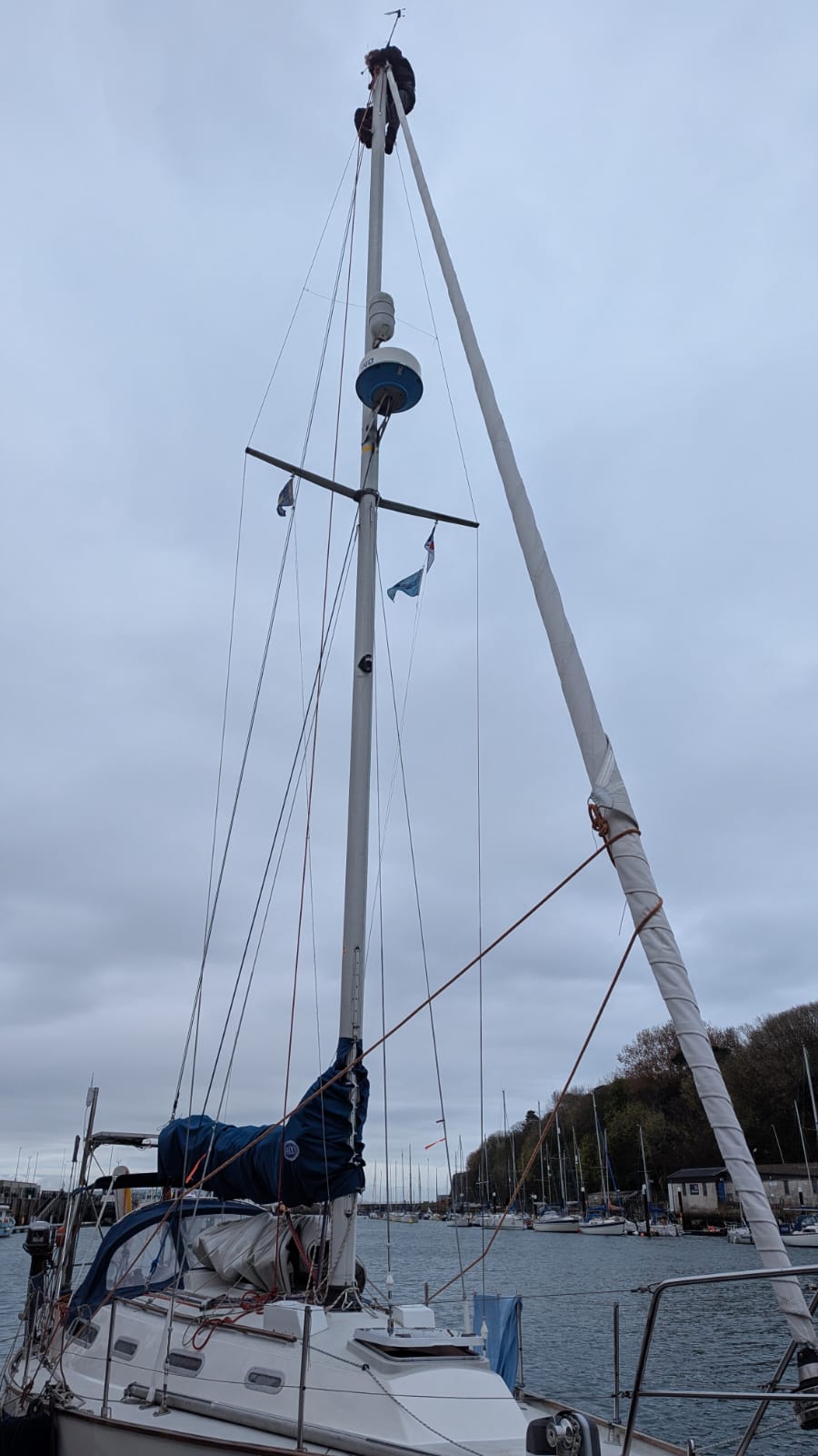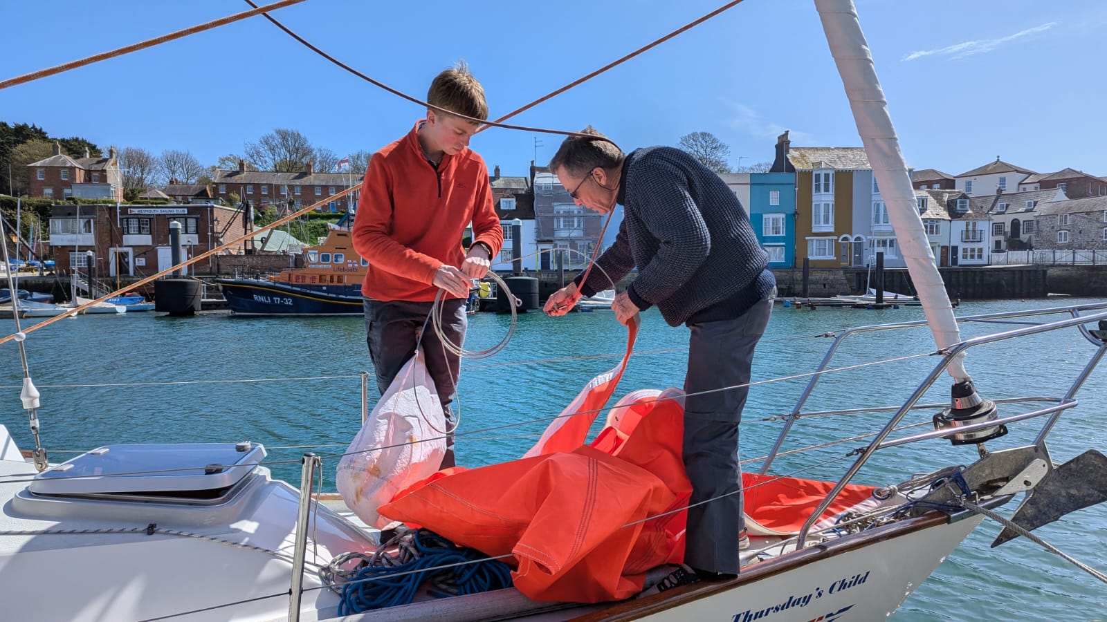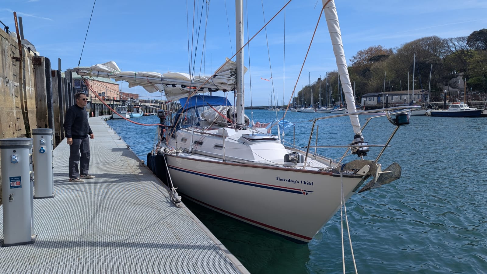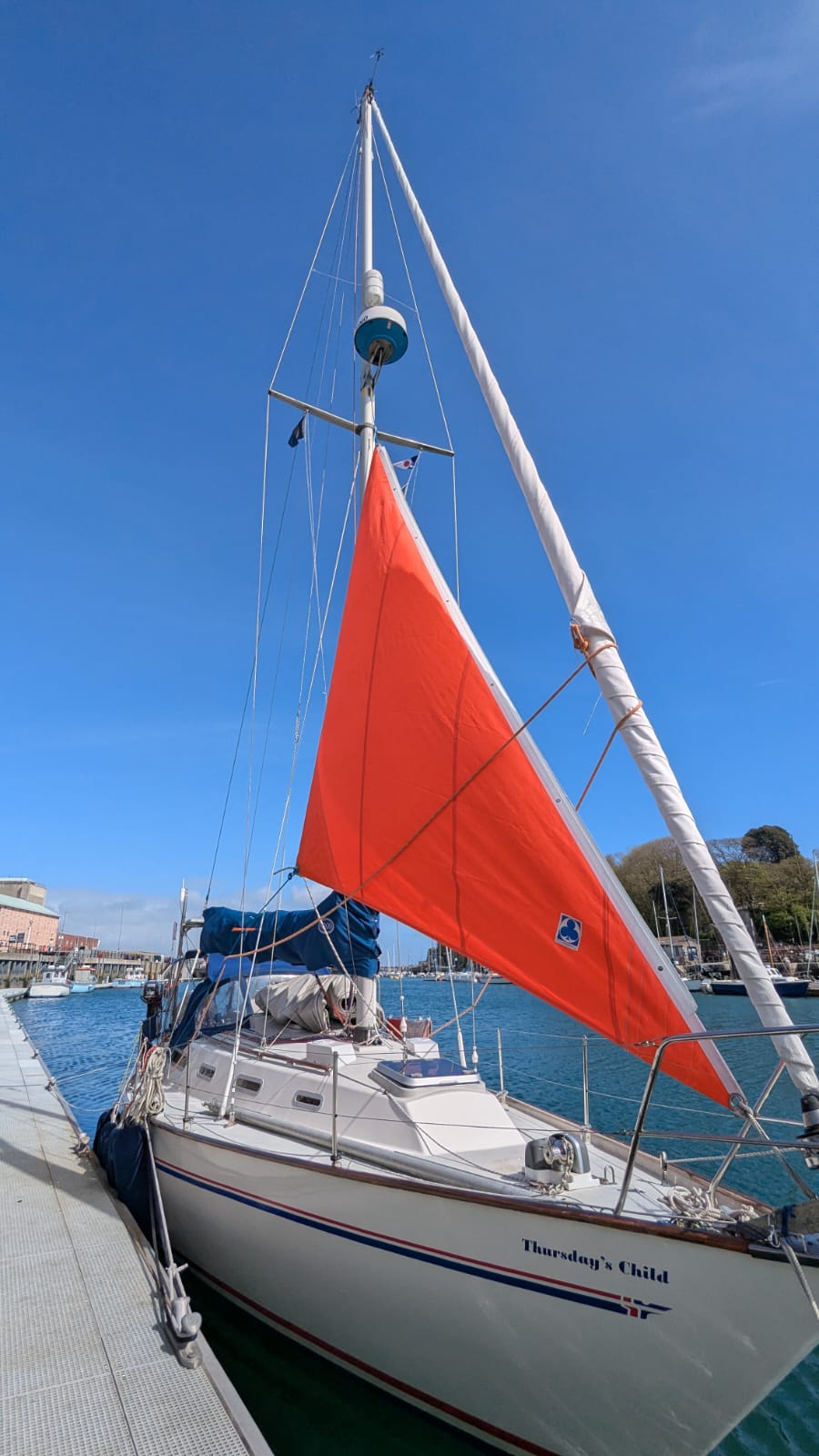 050:36.47N Friday 17 April Since arriving in Weymouth on Tuesday, we’ve spent our time waiting for the westerly blow to pass over before continuing on towards Dartmouth. The weather forecast looks like it will turn easterly on Sunday which is exciting. So Wednesday and Thursday have been filled with exploring and doing some walks locally, last time we were here was to watch the 2012 Olympics; now we are the only boat on the pontoon. Today we did some boat admin; Harry went up the mast with some PTFE spray as the jib was quite difficult to furl on Tuesday. The big difference between now and 2012 is that back then Harry went up the mast for fun, now he is being very helpful! In preparation for some hoped-for downwind sailing we set up a preventer on the main boom to help hold it in place and prevent any accidental jibes, luxury to be alongside a pontoon for this job. Plenty of curious by-standers asking what we were doing. We also reeved a third reefing line and dug out the bright orange storm jib and experimented with hoisting it in various ways; these latter two jobs were insurance against never needing them for real. We don’t plug into pontoon electrics as TC isn’t set up for that, so Bol has done an outstanding job with solar panels this winter. So much so that we were able to make our mid morning cuppa using a tiny 12v kettle powered by the sun, nice. Planning a trip to Portland Bill tomorrow, us going by bus and Harry has hired a bike. Then fingers crossed we’ll be underway early Sunday heading west. |