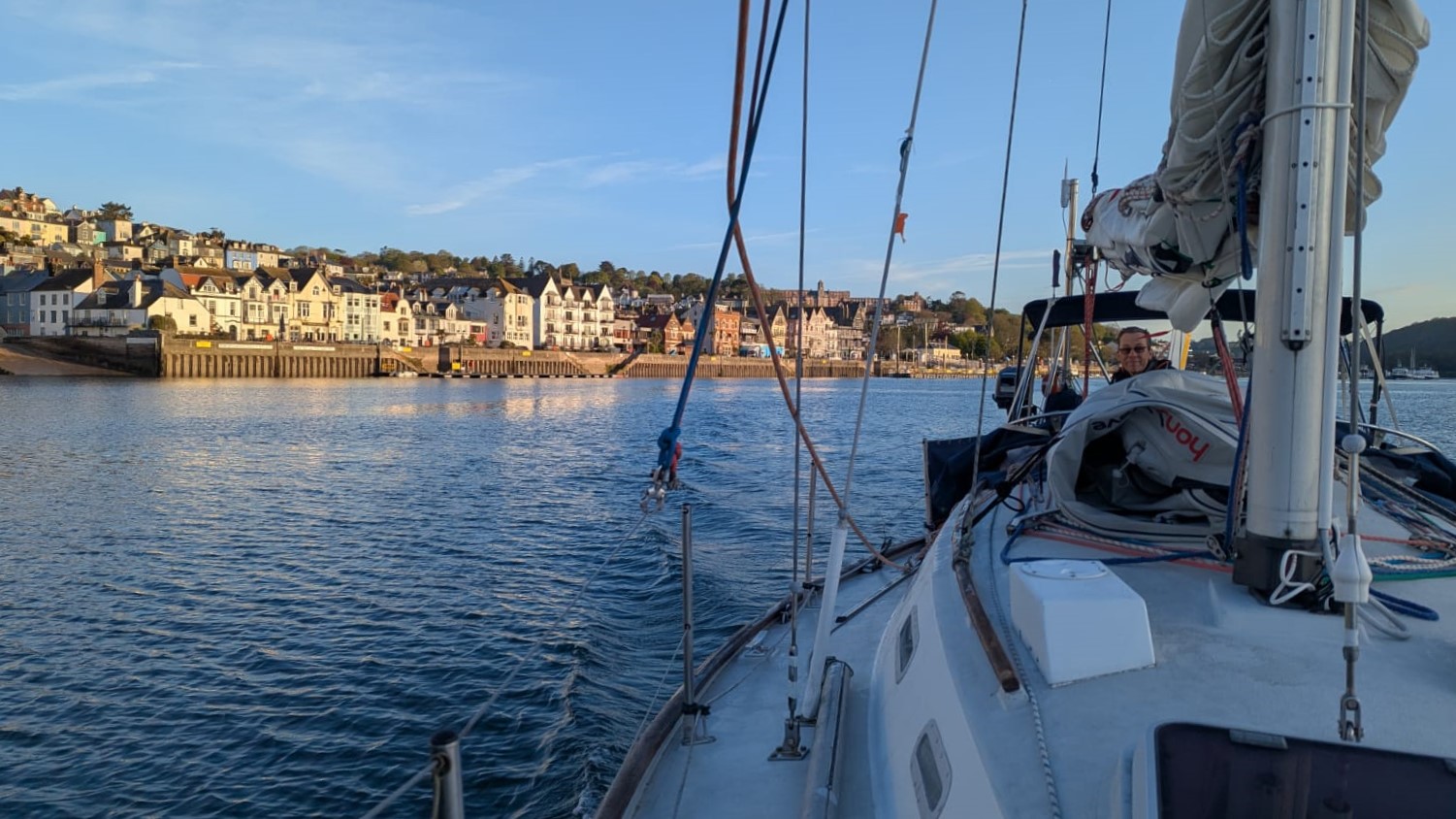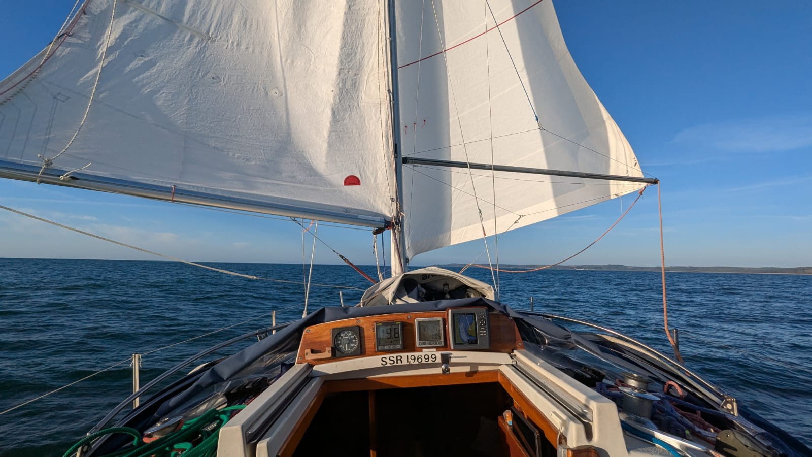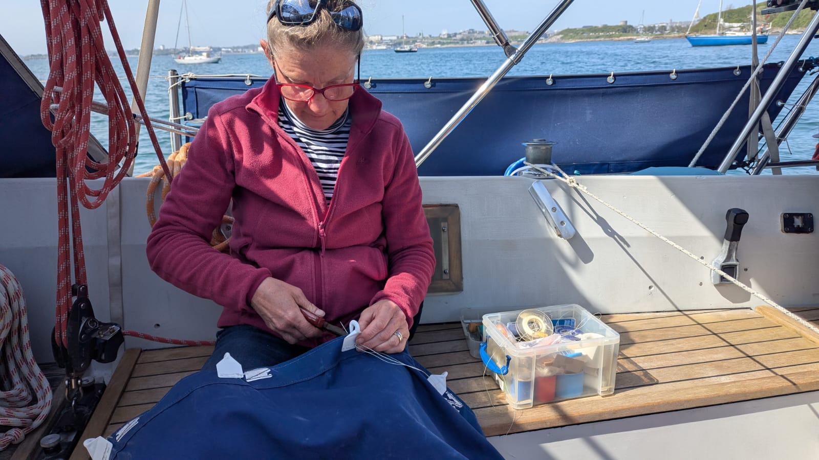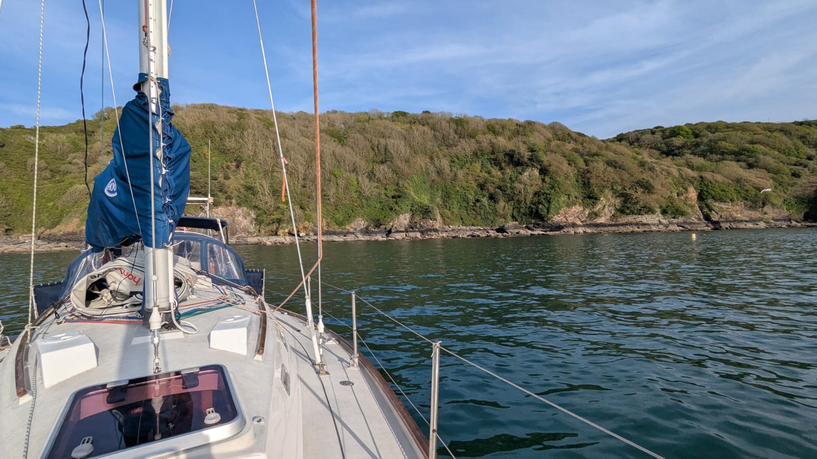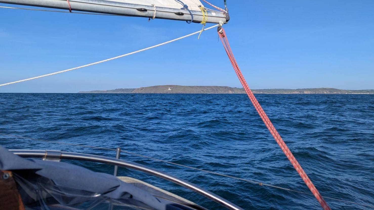 050:20.936 N 004:07.435 W Jenny Cliff Bay, Plymouth We heard the best sound in the world today ~ the fizz that sea water makes when you are sailing gently down wind. We ghosted out of Dartmouth bathed in dawn sunlight, then found to our delight the forecast was spot on ~ easterly 10-14 knots. We marked the moment passing Start Point by having one of Caroline’s flapjacks. Enormous thanks to Caroline, Marion and Sue for their flapjacks and cake, all much appreciated … although now down to our last few precious squares. We had a gorgeous sail around the headlands to Plymouth; hot in the sun, wind on our backs, jib poled out and preventer on the main. It was fun to see the coastline from the sea accompanied by a constant roar from the swell as it worked its way along the craggy rocks. We were interrupted on several occasions by excruciatingly high-pitched continuous, high-priority DSC alarms from a vessel in distress. Until the button on the VHF is turned off, the alarm just gets louder and louder; clever tech but deafening if steering and unable to leave the tiller. We then listened to Falmouth Coastguard establishing the facts and subsequently coordinating the rescue; as we approached Plymouth we could see their Lifeboat heading out into the Channel. We sailed right into the anchorage here at Jenny Cliff Bay in Plymouth and are rocking gently now that the wind and swell have died down. A few running repairs to the mainsail cover in the cockpit before relaxing after our early start. Our plan is to sail to Falmouth tomorrow, and Penzance on Monday, then once the forecast blow goes through, we have a decision to make which way to go; Isles of Scilly, Milford Haven or Southern Ireland….. |